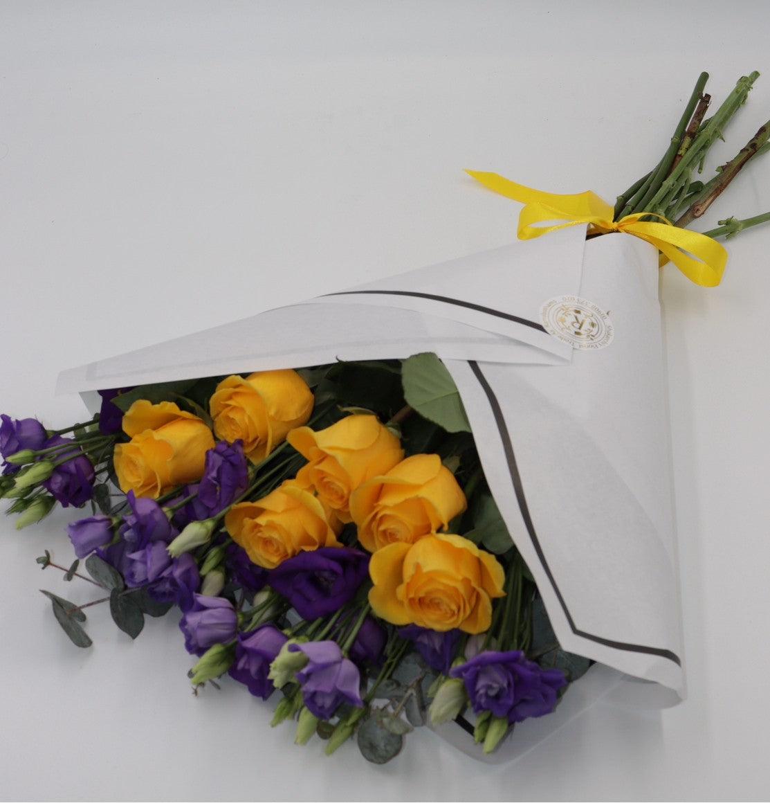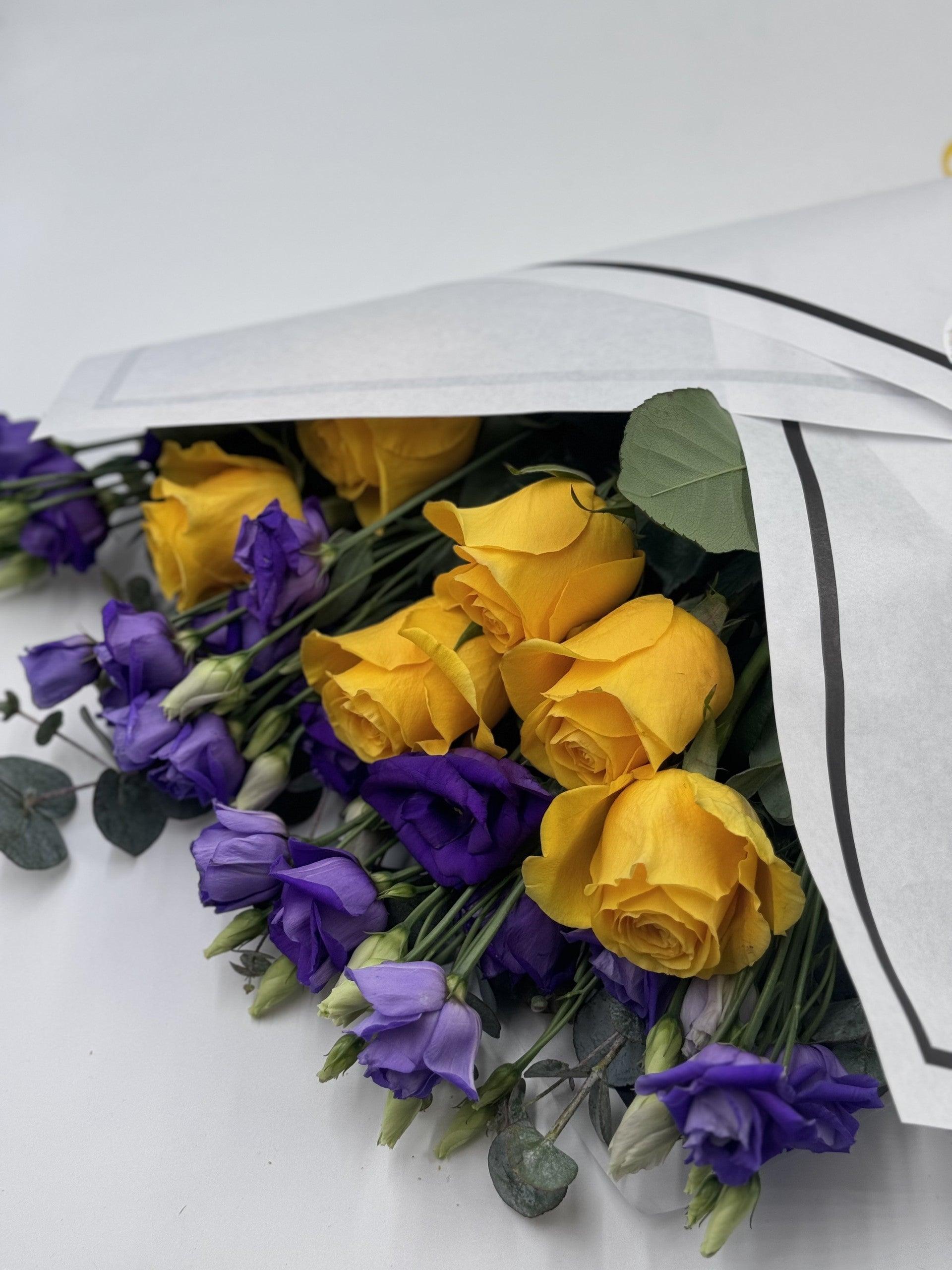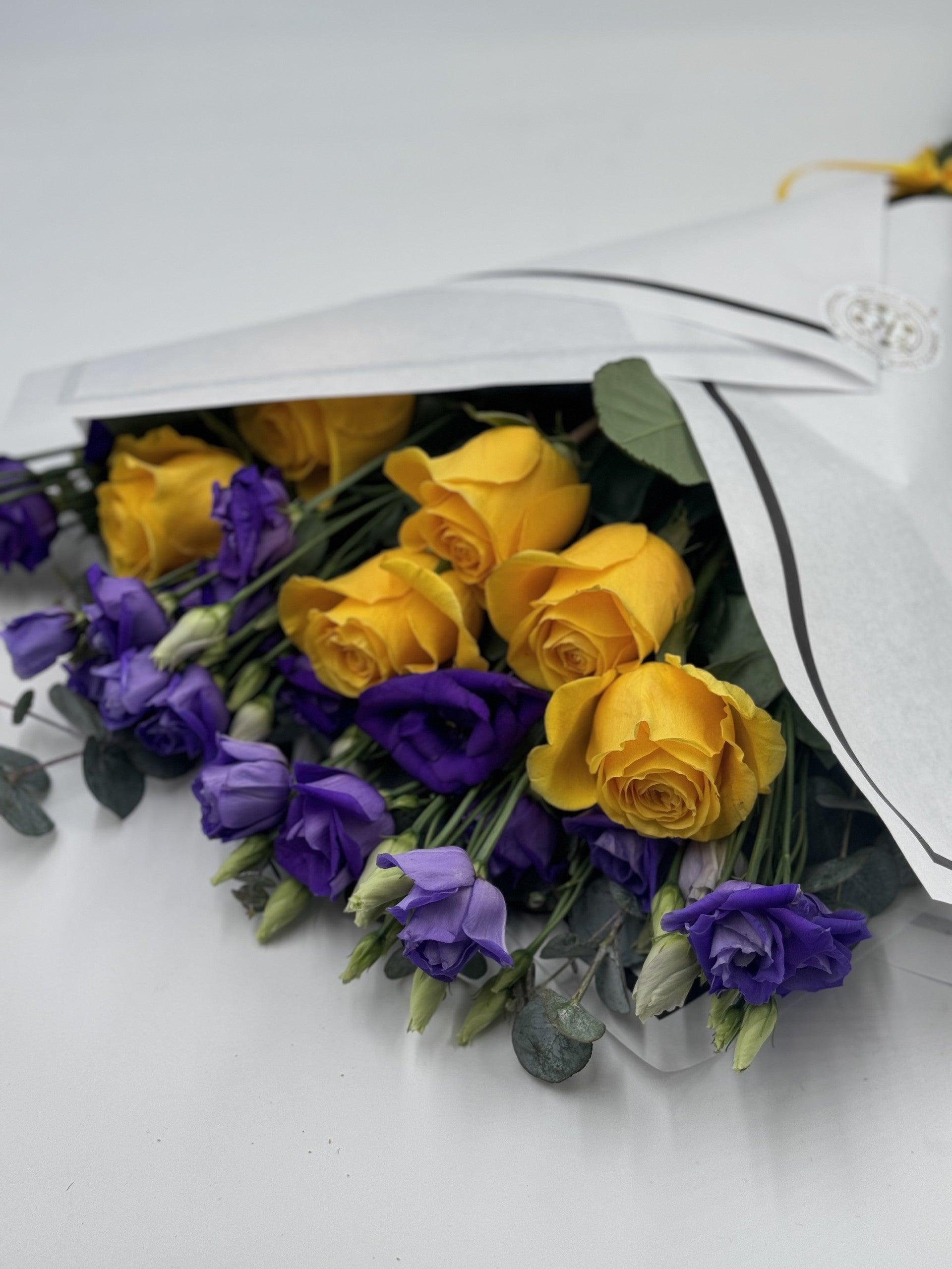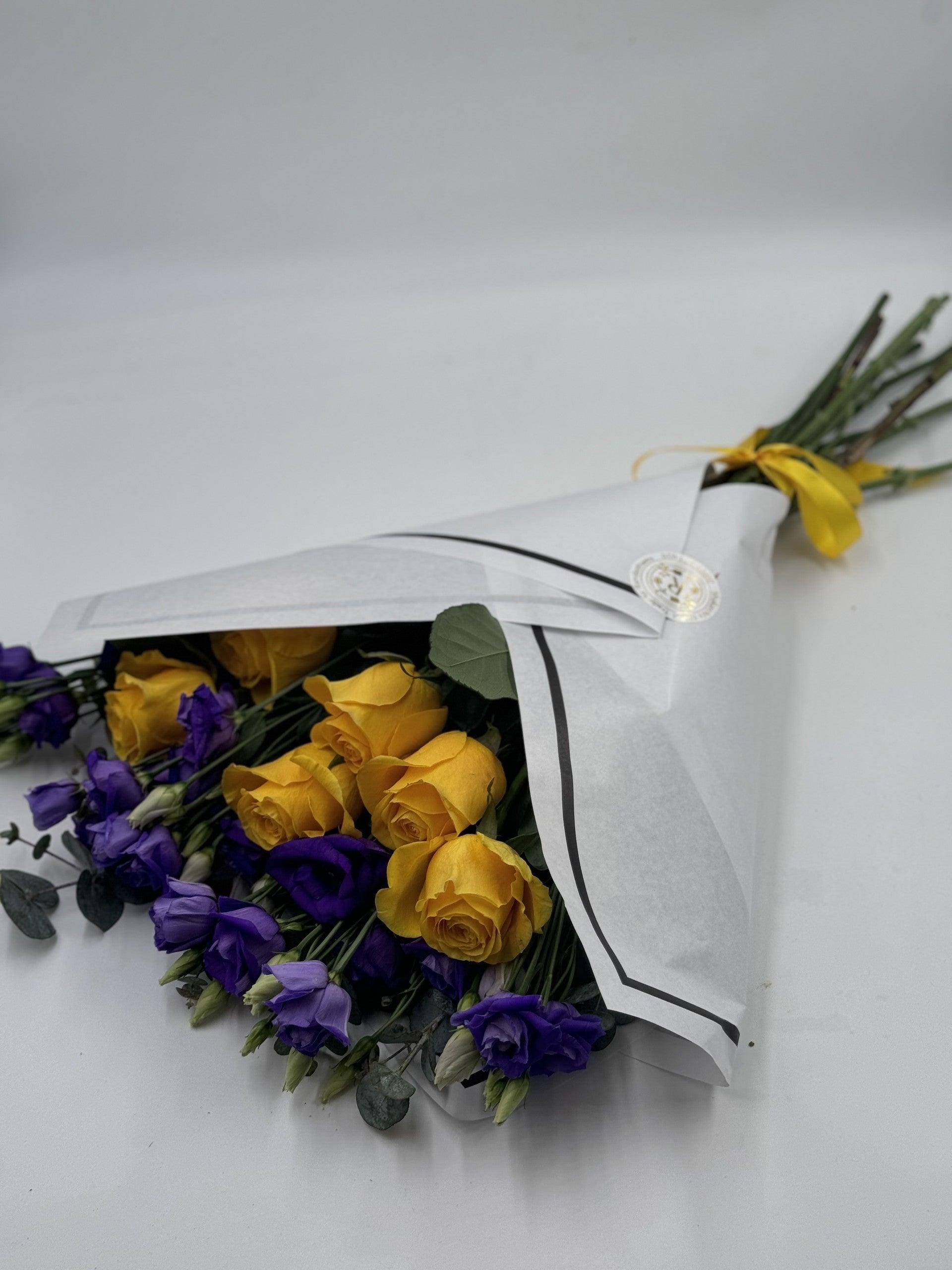 Make a bold statement with our Beautifully Simple Flat Bouquet. Featuring stunning yellow roses and vibrant purple lisianthus, complemented by soft green and grey foliage. This bouquet exudes elegance and simplicity, perfect for any occasion. Embrace the beauty of nature with this captivating and effortless arrangement.