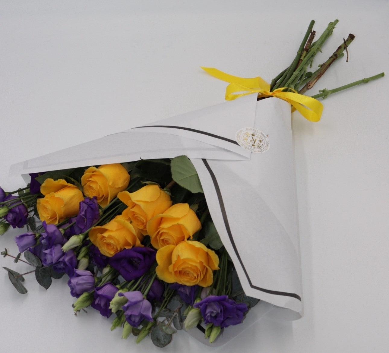 Beautifully Simple Flat Bouquet Yellow roses & Purple lisianthus