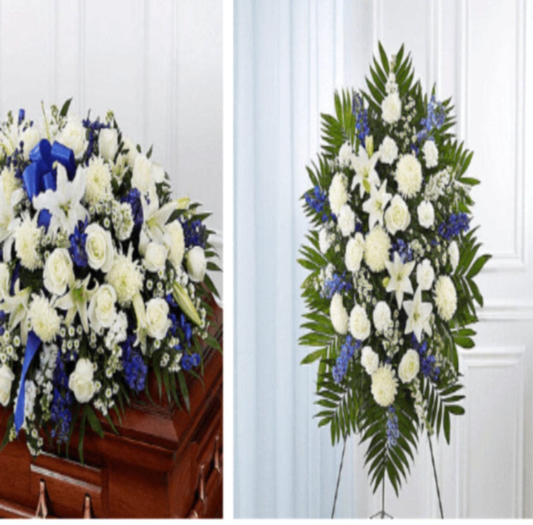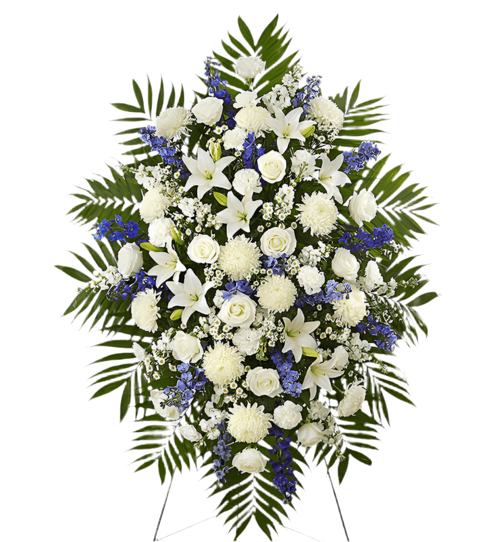 Send this beautiful blue and white standing spray to the funeral service for a grand display of blue and white flowers. Filled with soft blue delphiniums, white football mums, roses, statice, lilies and so much more. This is a beautiful way to send your kindest condolences.