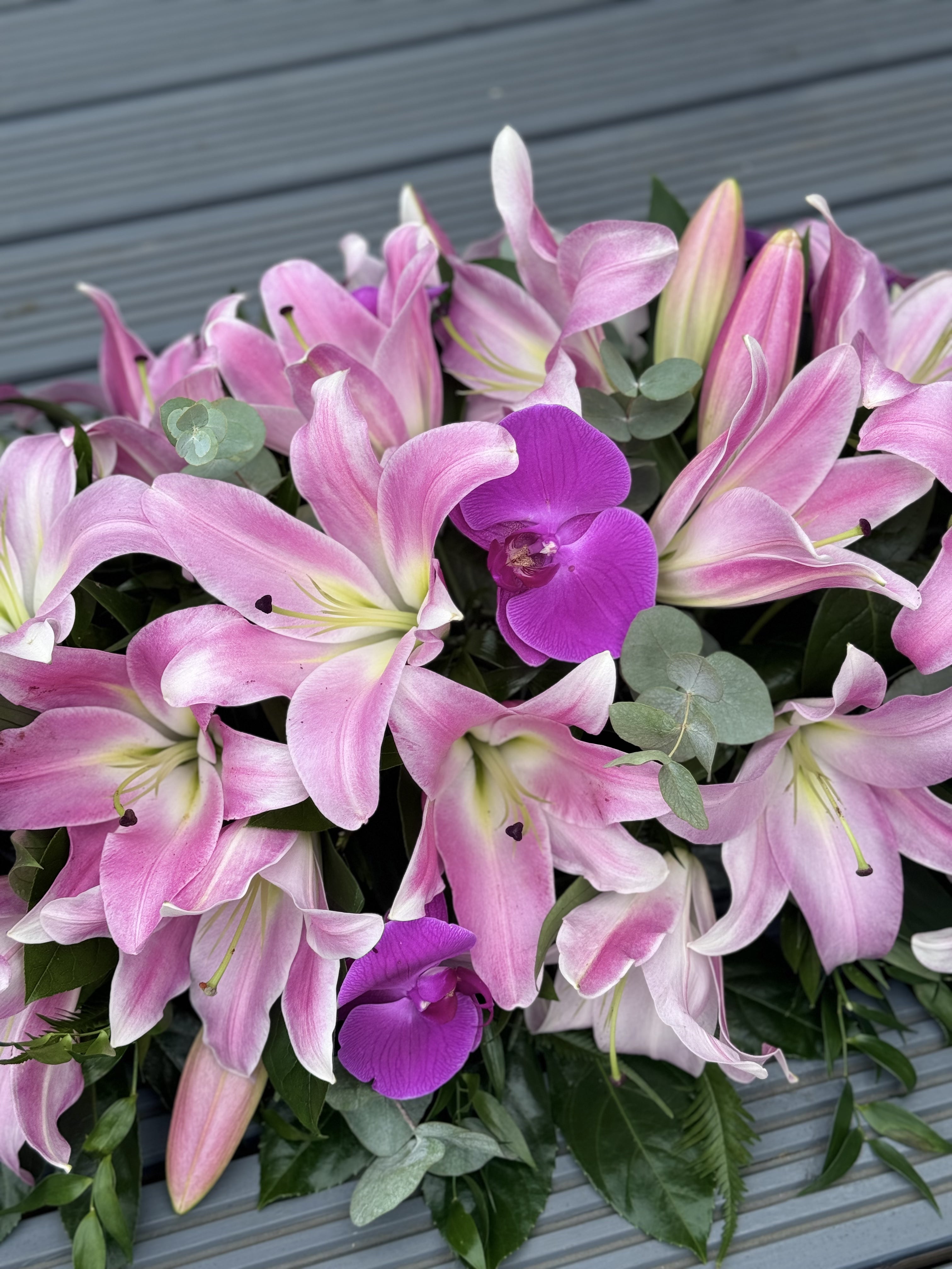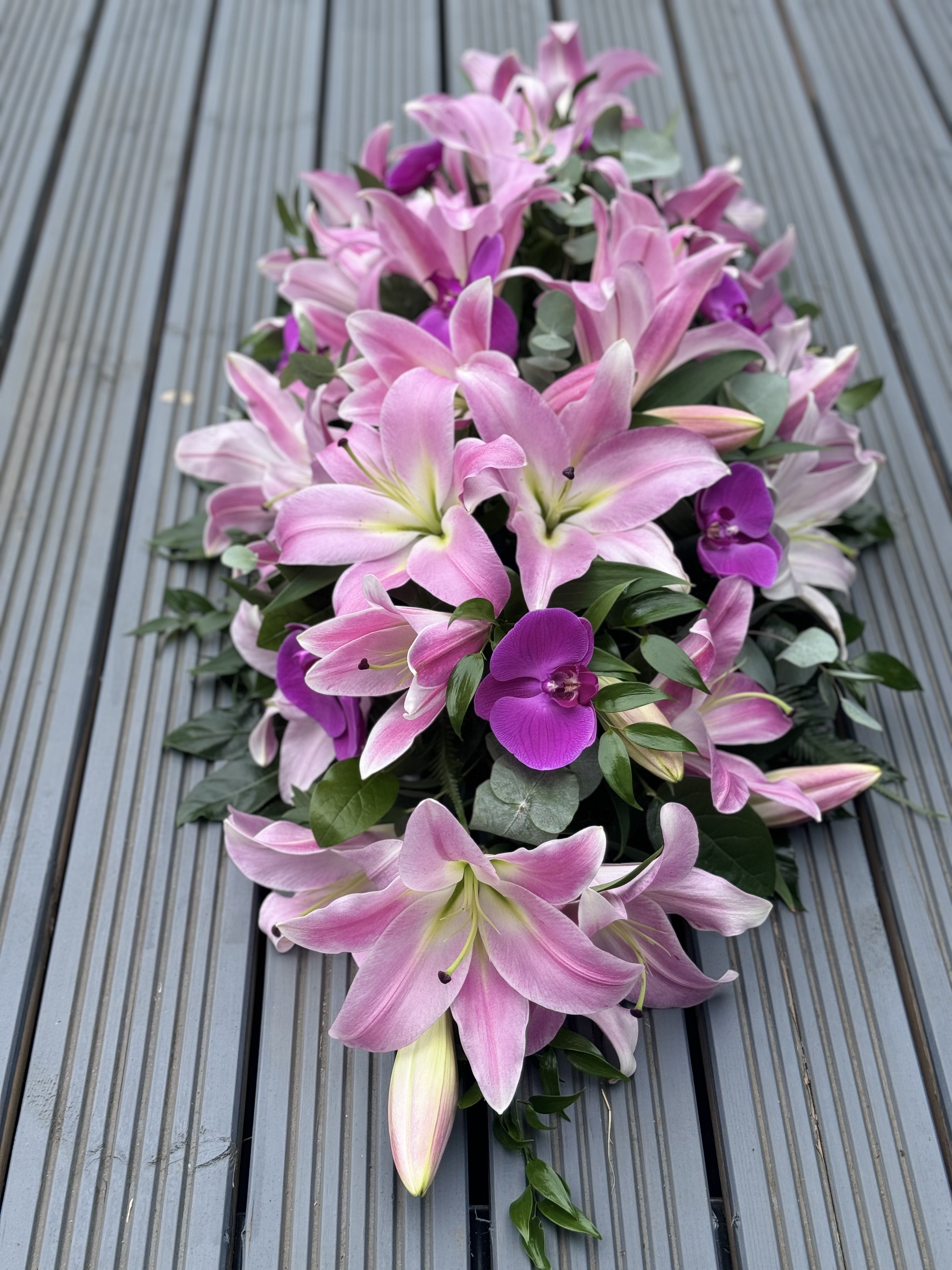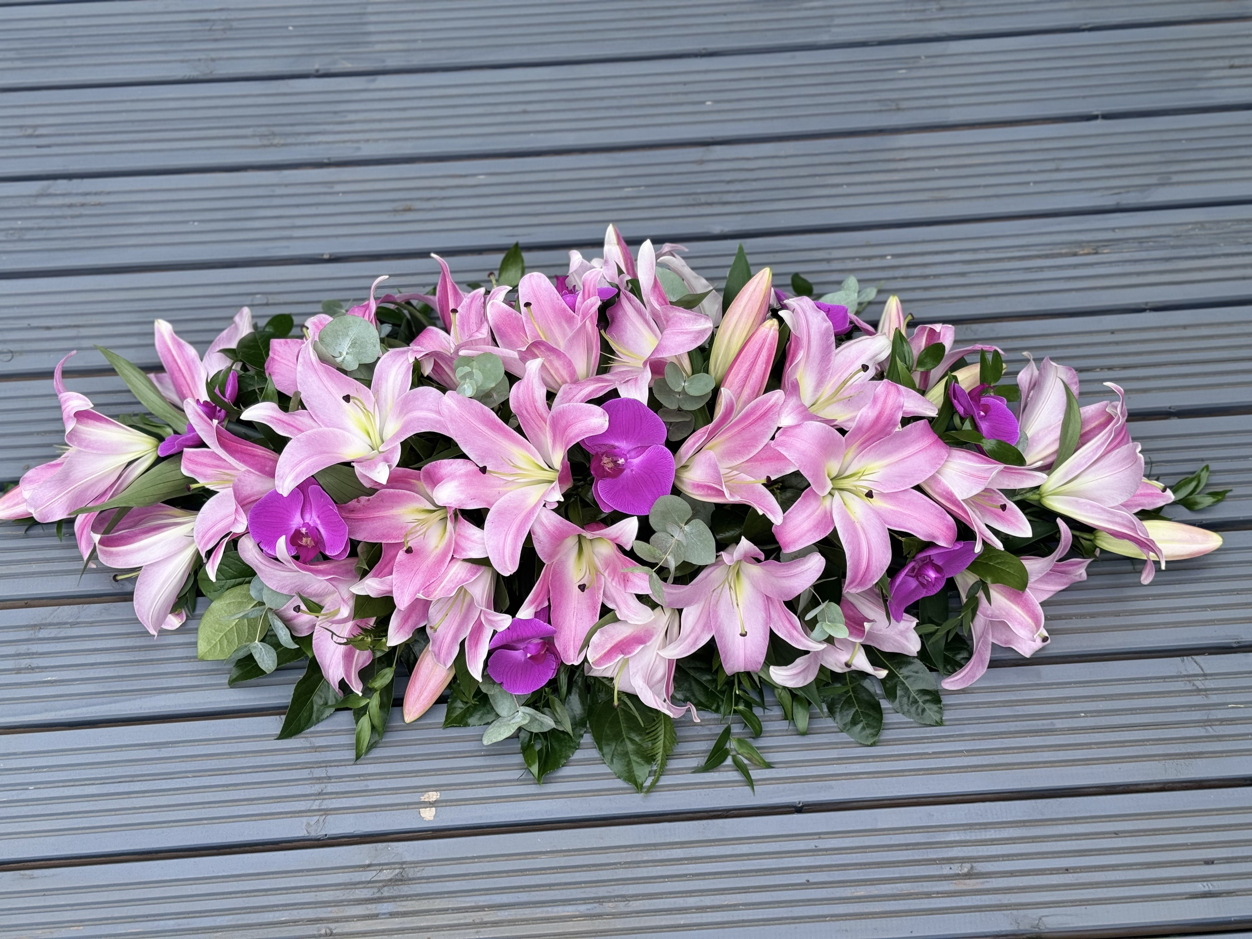 Elegant Pink Lilies and Orchid Casket Spray - 3ft is backordered and will ship as soon as it is back in stock.
