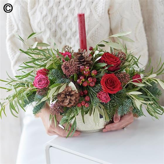 Our biggest candle arrangement, this one will bring all sorts of joy to the Christmas day table. Exquisitely handcrafted by their local florist, they'll use the freshest blooms they have in shades of plum and burgundy, red and green, with highlights of soft pink and copper.