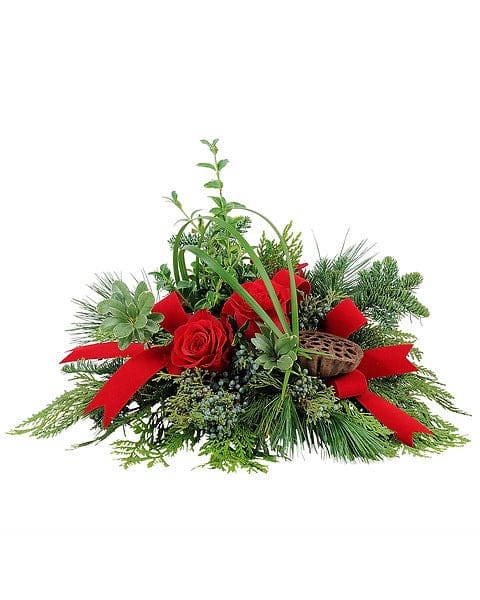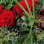 A simple arrangement of rich roses, evergreen and pods with accents of velvet ribbon.