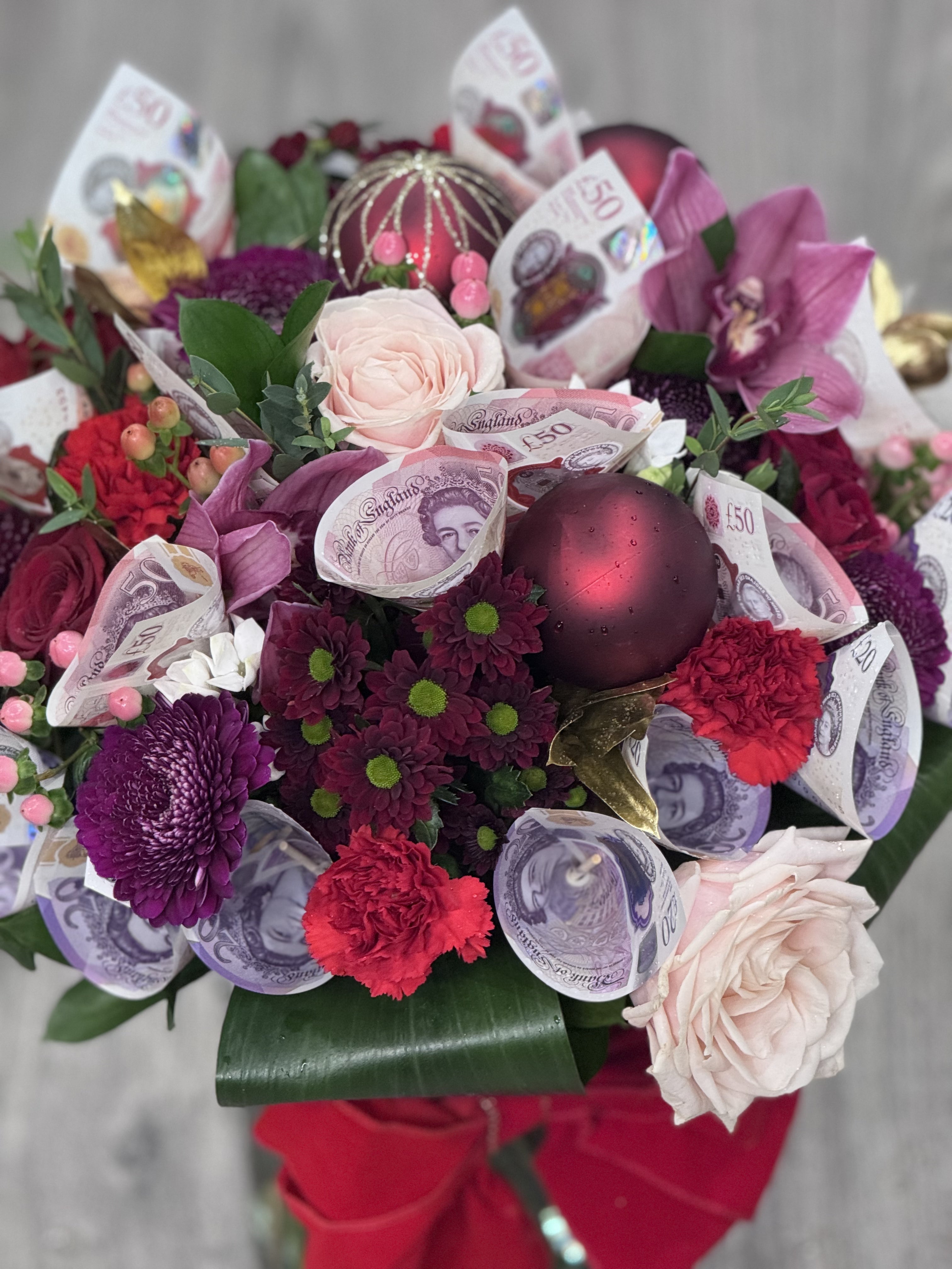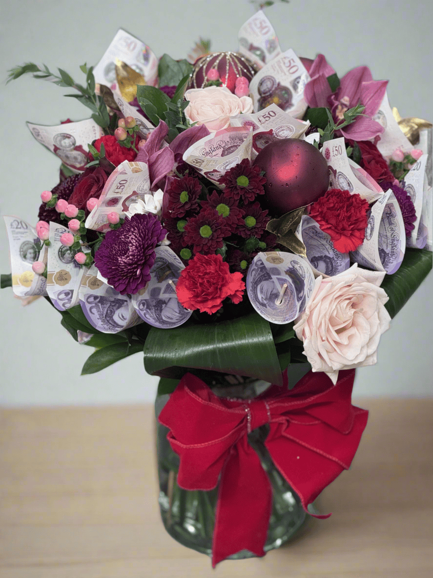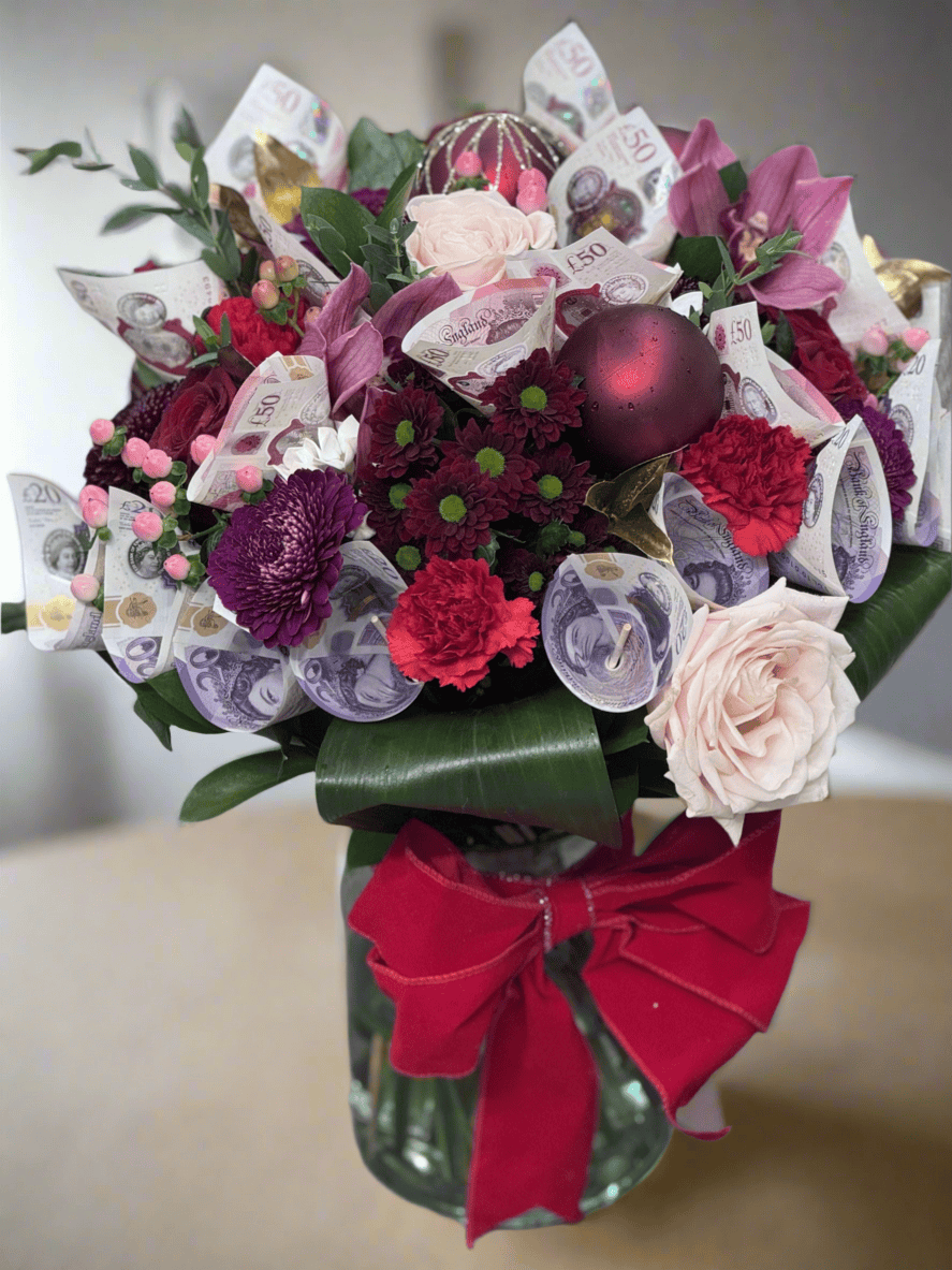 Get ready for the holiday season with our Christmas Red Glamour Money Bouquet! Each bouquet is carefully crafted with red, festive details and filled with money, adding a touch of glamour to your celebrations. Give the gift of style and practicality with this unique bouquet. Perfect for spreading holiday cheer!