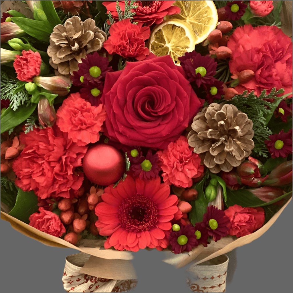 Brighten up your holiday with our Small Rosy Reds Christmas Bouquet. Featuring vibrant shades of red, this handcrafted bouquet is sure to add a touch of festive charm to any home. Perfect for gifting or decorating your own space, this bouquet is a must-have for the holiday season.