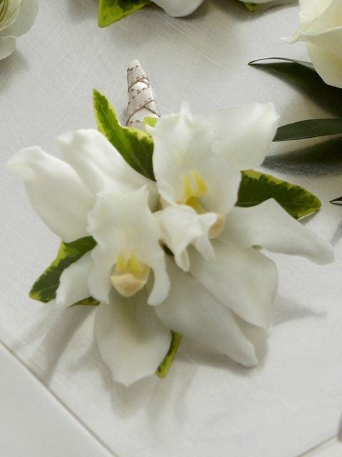 This beautiful boutonniere brings an exotic elegance and stylish appeal to the overall look of the wedding party. Boasting two blooms of white mini cymbidium orchids accented with variegated ivy, this boutonniere is a modern take on the traditional boutonniere. Approximately 13cm high and 10cm wide.