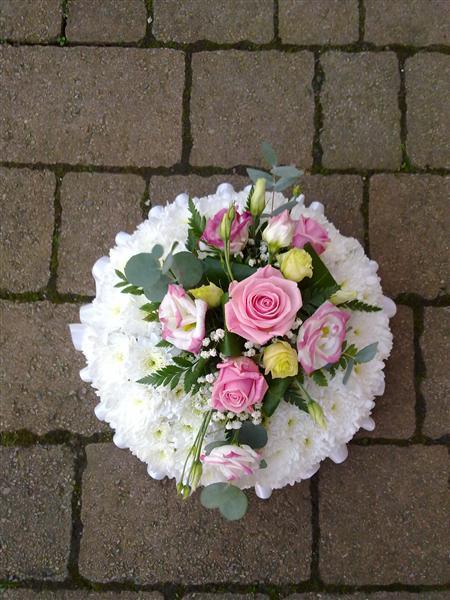 A pretty and popular design from Rams florist,This posy features roses resting on a beautiful bed of white chrysanthemums.
