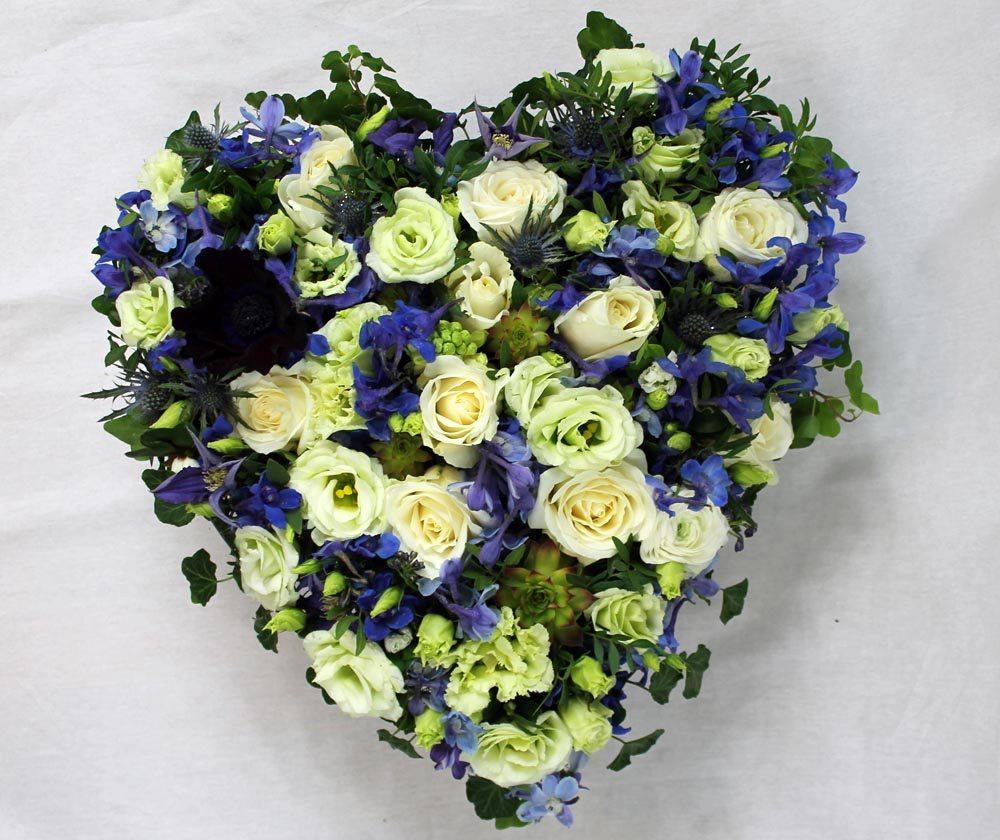 A heart tribute in beautiful blue & white shades, featuring fragrant stocks and lilac roses.