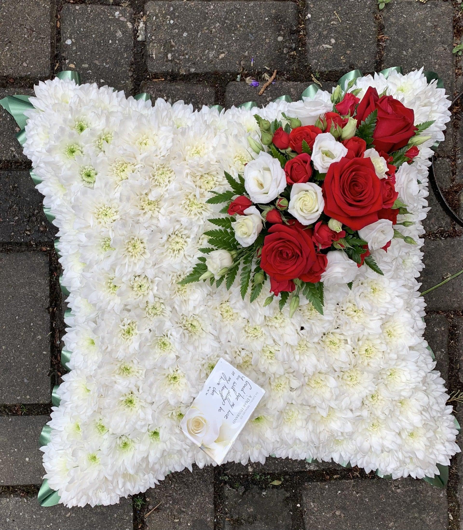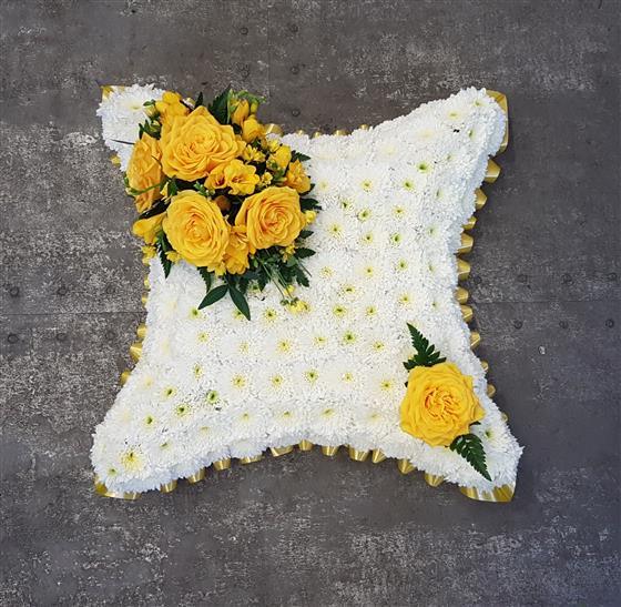 A white double Chrysanthemum based Cushion with either a foliage or ribbon in a colour of your choice. We recommend having matching coloured ribbon and flowers.