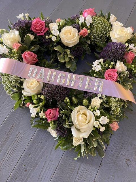 This open heart arrangement includes fresh roses, spray roses, Ammi Visnaga ,Trachelium Imp and pittosporum and leather leaf.