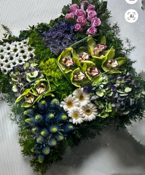 A carefully crafted and arranged patchwork pillow made from roses, chrysanthemums, orchids, lisianthus and other blooms and grasses. Each patch can be customised with specific colours or flowers.