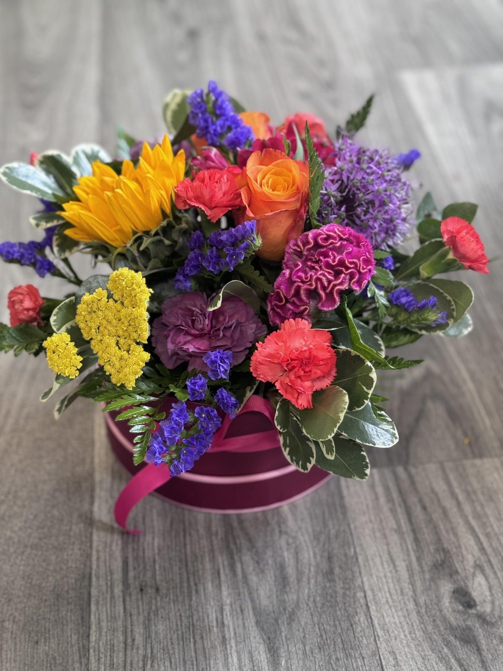 This hatbox is for beautiful, bright blooms! Crafted by hand by a local florist, this lovely display of vibrant flowers will bring all sorts of colour to mum's day.
