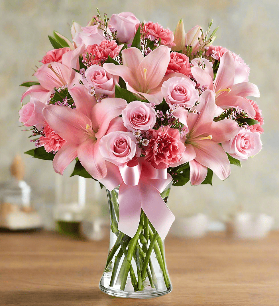 Indulge in the beauty and fragrance of the Always On My Mind Flower Bouquet. With a delicate mix of pink blooms, this bouquet is a thoughtful and elegant gift that will always be remembered Perfectly with pink roses, pink carnations, lilies and pink filler flowers this will bring joy into their day.