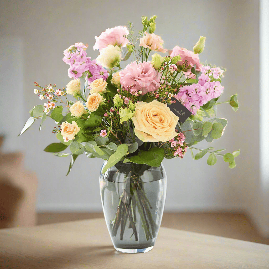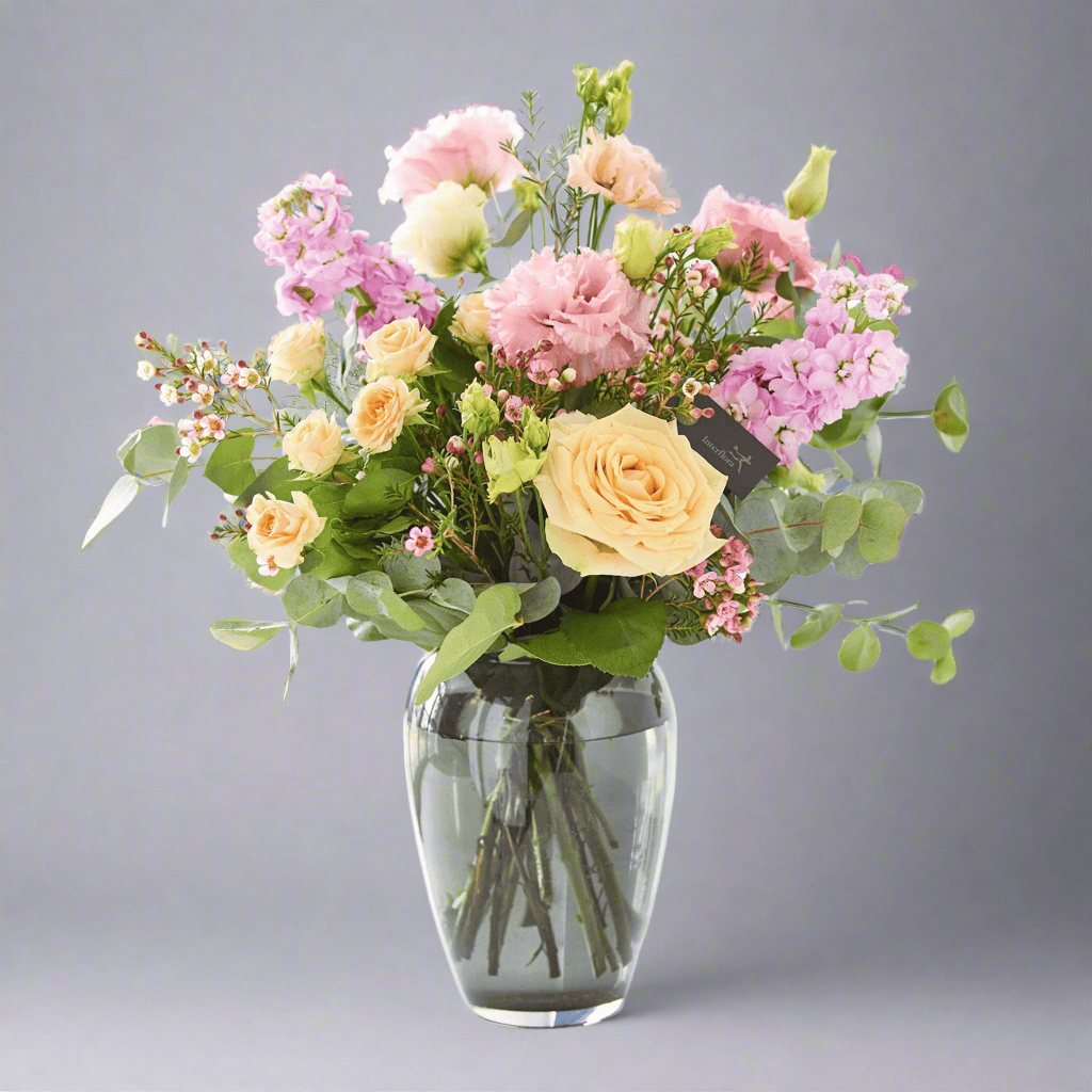 Introducing our Luxury Pastel Bouquet in a Vase. This stunning arrangement features a colorful selection of pastel flowers, expertly arranged in a beautiful vase. Perfect for adding a touch of elegance to any room or as a thoughtful gift. Elevate your decor with this gorgeous bouquet.