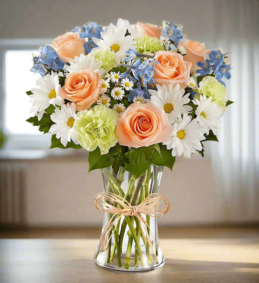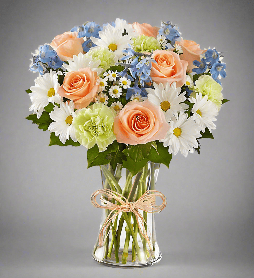 This expertly designed Morning Melody Bouquet is the perfect combination of elegance and freshness. Its vibrant colors and delicate arrangements are sure to brighten any room and bring joy to any recipient. remembered Perfectly with peach roses, chrysanthemum , Carnations & delphinium  Made with the highest quality flowers, this bouquet is a beautiful and thoughtful way to show your love and appreciation.