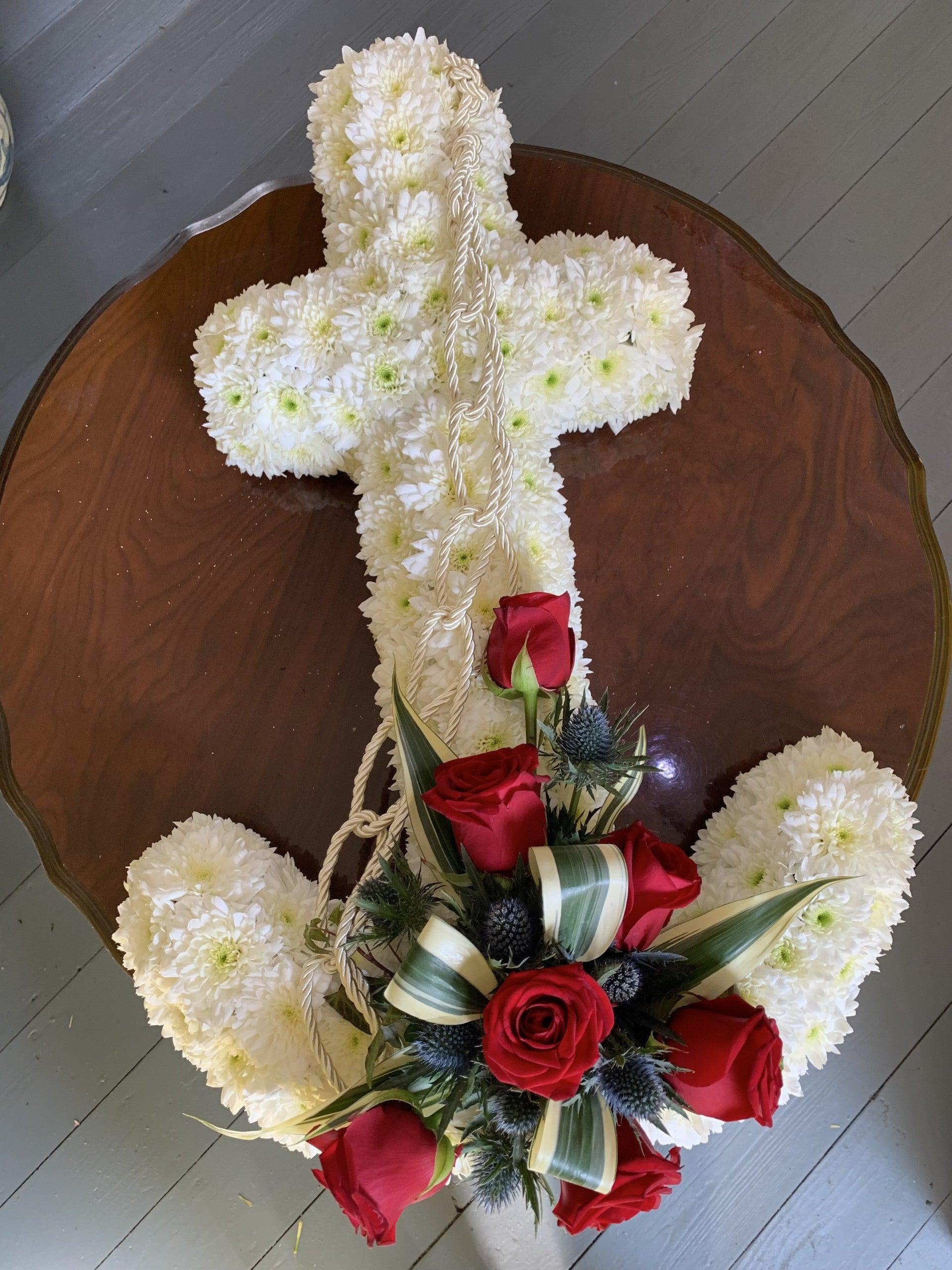 An anchor shaped design using a mass of white double spray chrysanthemums with a feature spray of red short stemmed roses and a contrasting blue eryngium. The tribute is finished with green foliage and a silver cord.
