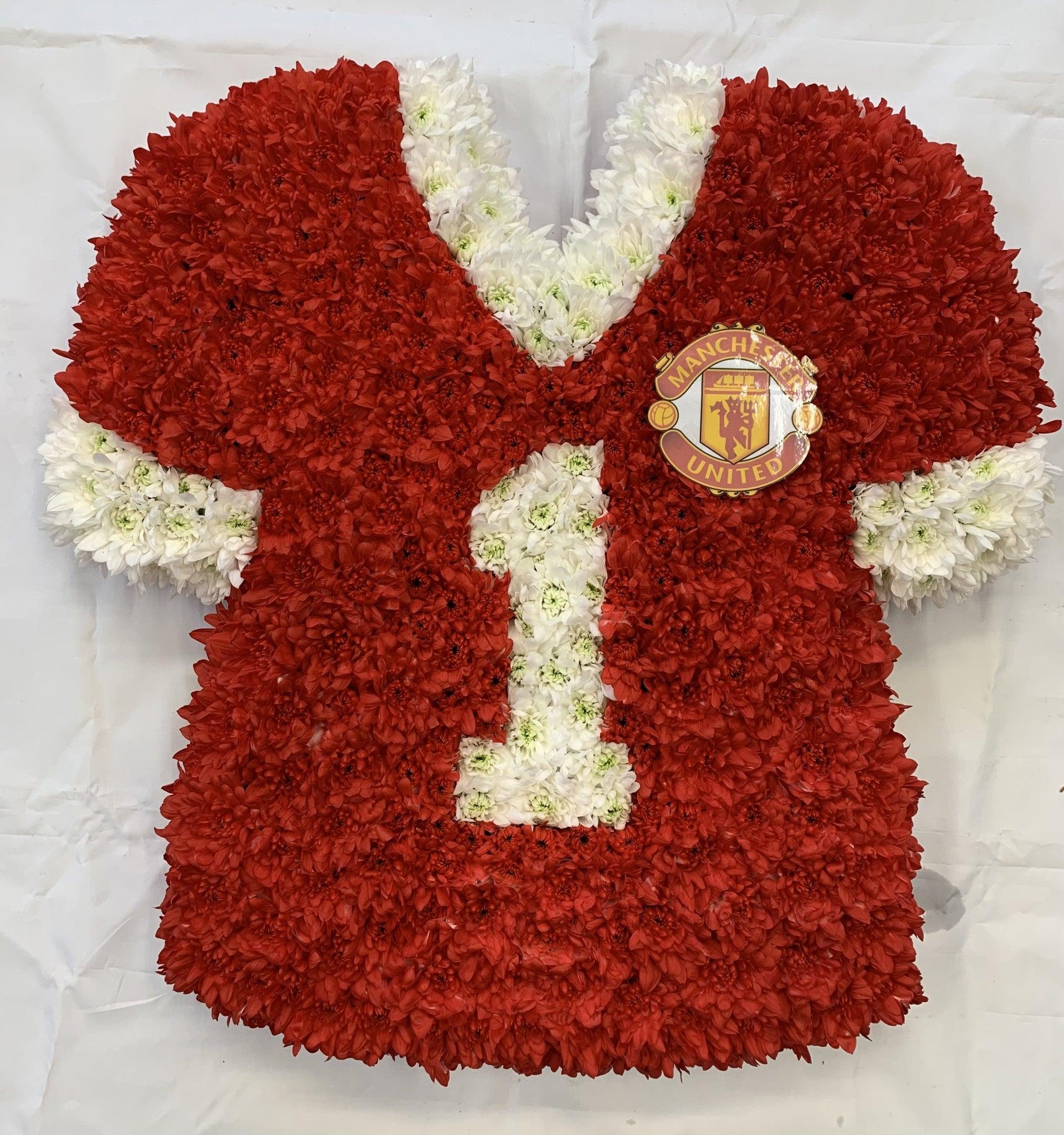 Double spray chrysanthemums and spray carnations are used to create this red and white football shirt design.
