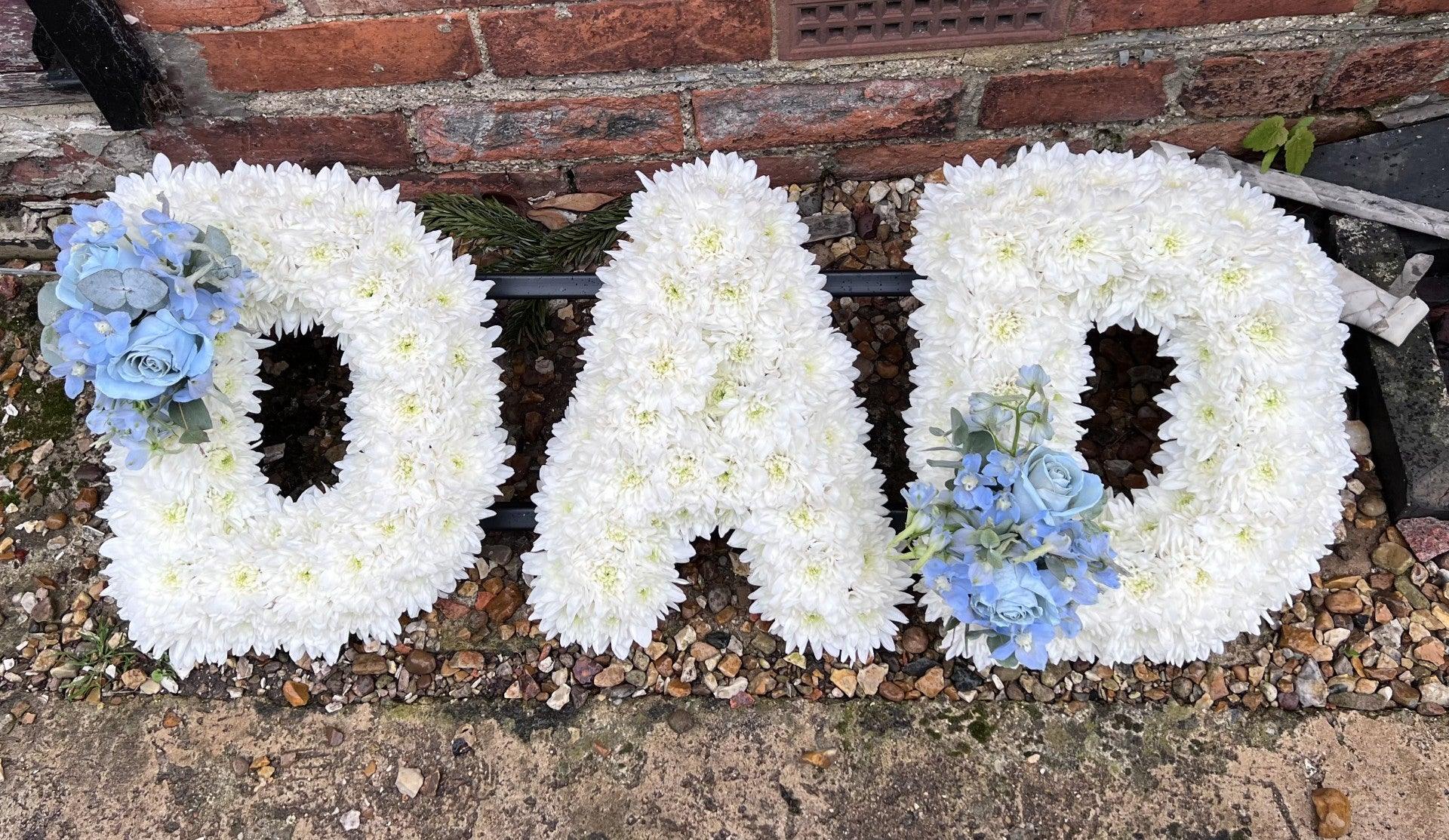 This elegant tribute is crafted using white chrysanthemums, finished with clusters of blue and white blooms including clematis and lisianthus. Approximate Product Dimensions: Length: 90cm, Height: 37cm.