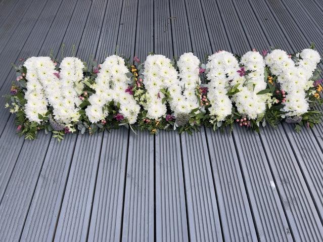 A mass of white double spray chrysanthemums is finished with delicate sprays of roses and lisianthus in white and purple to create this Dad tribute.for Milton Keynes only