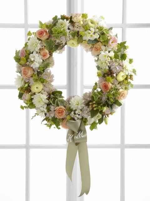 The Sweet Celebration Wreath will bring a touch of grace to your ceremony or celebration on your wedding day. Peach roses, white dahlias, pale pink hydrangea, white freesia, pale yellow ranunculus, pale pink lisianthus, peach hypericum berries and an assortment of lush greens are arranged to form a beautiful wreath accented with a light green satin ribbon monogrammed with the initials of the bride and groom. Approximately 60cm in diameter.