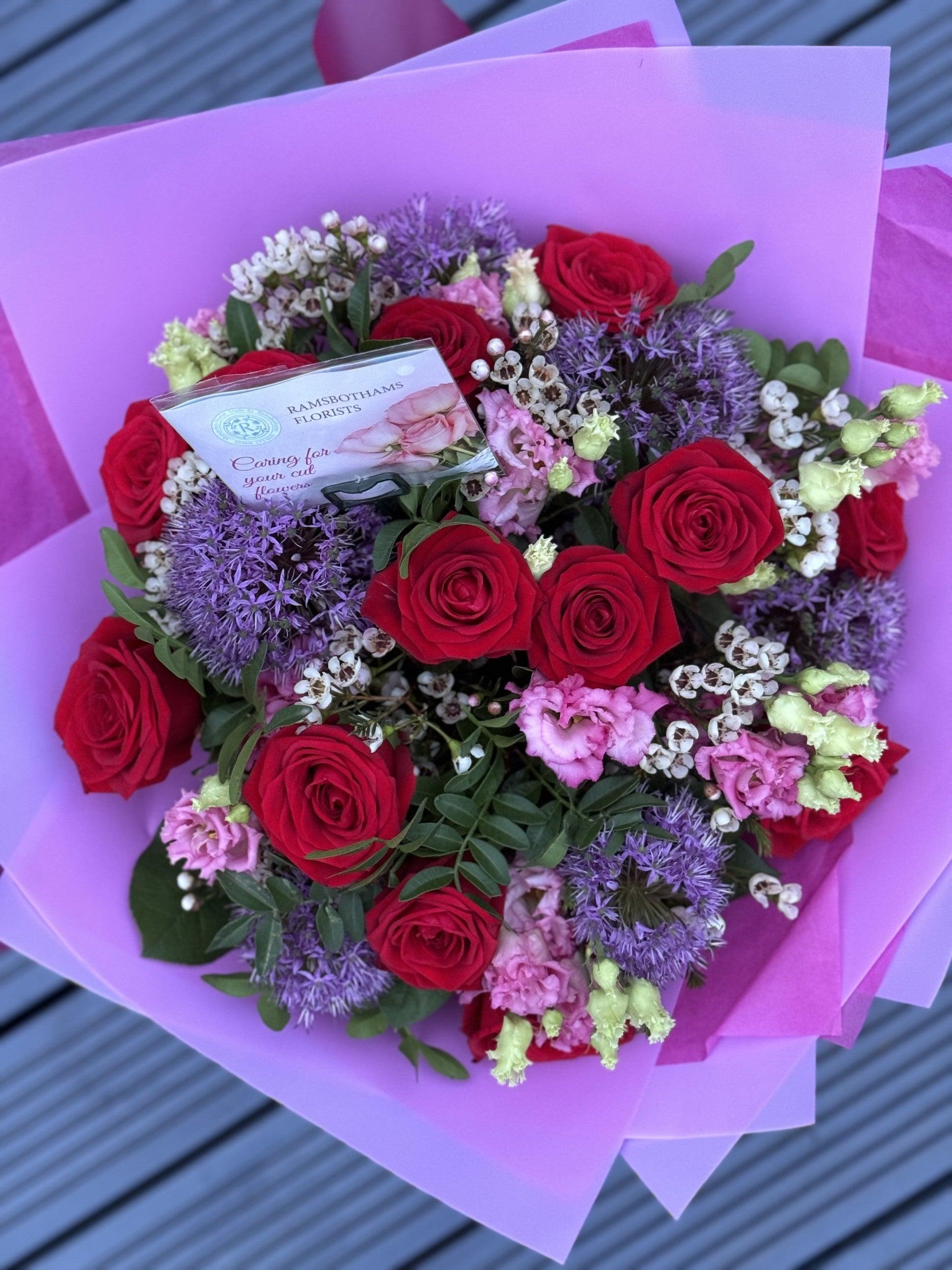 Luxury red roses, with allium & lisianthus exquisitely arranged by a local florist. Because every bouquet is bespoke, yours might look a little different to the one in the picture but don’t worry it’ll still be just as beautiful.
