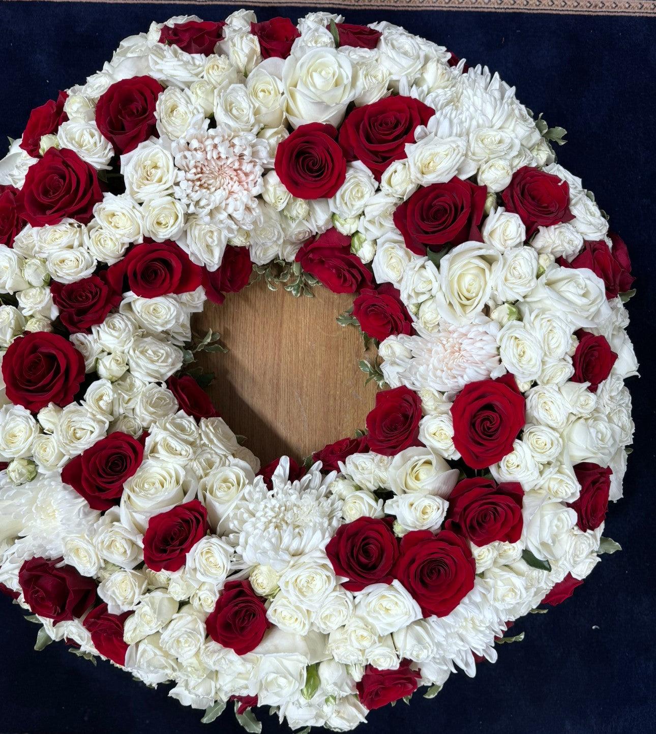 Expertly crafted from vibrant red and pure white and roses . this stunning wreath from Rams florist is the perfect way to honor a special loved one. Celebrate their life with the timeless beauty and delicate fragrance of this elegant wreath.